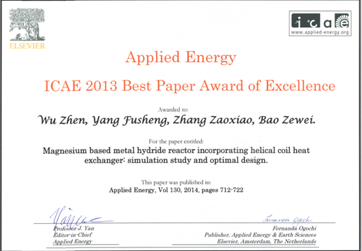 2015年3月30日,在阿联酋阿布扎比市举办的The 7th International Conference on Applied Energy(ICAE2015)上,9001cc金沙张早校教授领导的科研团队第一作者为博士生吴震的一篇论文被授予大会“Best Paper Award of Excellence”。获奖论文题目为“Magnesium based metal hydride reactor incorporating helical coil heat exchanger: simulation study and optimal design”。论文为氢能的存储提供了一种新型的反应器模型及其性能评价方法,该研究成果对实现镁基反应器的高效储氢具有重要的科学意义。该论文于2013年以口头报告的形式发表在南非召开的The 5th International Conference on Applied Energy(ICAE2013),并于2014年被ICAE2013会议学术委员会推荐发表在能源权威国际期刊Applied Energy(SCI源刊,IF=5.261)上[Applied Energy, Vol. 130, 712-722, 2014],且被该期刊主编评价为先进储能技术的一种创新。经过ICAE学术委员会的评选,于2015年获得ICAE2015会议的“Best Paper Award of Excellence”。ICAE每年颁发“Best Paper Award of Excellence”,“Best Paper Award”,“Best Paper for Young Scientists”等奖项,其中“Best Paper Award of Excellence”为该会议的最高奖项,由Applied Energy期刊和Elsevier出版社联合颁发,每年授予的名额只有2名。