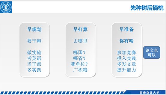 “宜未雨而绸缪,毋临渴而掘井。”沈人杰指出,研究生一定要有自己的职业规划,根据自己的情况来确定将来是出国、就业还是读博,越早规划越重要,然后朝着自己规划的目标不断去奋斗。沈老师通过展示学院过去几年学生的就业情况,对新生的职业规划提出了具体的建议。