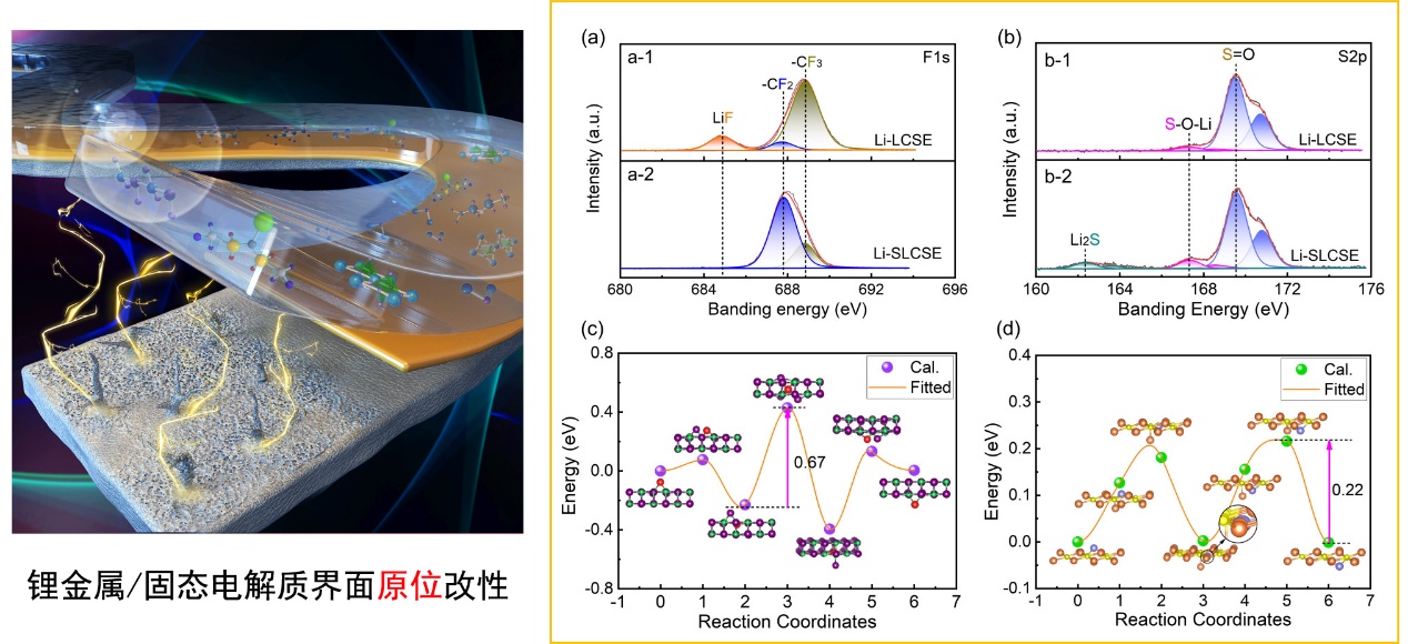 针对上述问题,9001cc金沙唐伟教授团队与新加坡国立大学化学与生物工程系郑光远助理教授、北京航空航天大学缪奶华副教授合作,联合报道了一种3Li2P⸱2P2S5-LiTFSI-PVDF复合固态电解质(SLCSE)。该复合固态电解质在电池充放电过程中,能够在锂金属负极表面原位生成一种含Li2S修饰的界面层。实验结果显示该界面层能够减缓复合固态电解质中PVDF的分解。结合理论计算发现该界面层还可以同时提升复合固态电解质与电极之间的界面接触性能,并降低锂离子通过界面层的势垒,有效改善了锂在负极的沉积均匀性,从而抑制锂枝晶的生长。