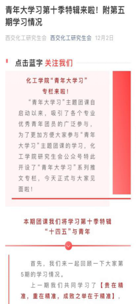 学院团工委依托学院官网和化工研会公众号两个平台,发布讲座通知预告、重大新闻、学院特色活动等,同时副书记和辅导员可以通过新媒体平台为同学们转发推荐有思想的精品文章供同学们学习,开展宣传教育。利用“网上共青团”进行智慧团建,学社衔接率达100%,升学衔接率达97.5%,星际团支部评定工作完成率100%。“青年大学习”工作持续推动,利用公众号每周通报学习情况,加强了团员日常思想政治教育。