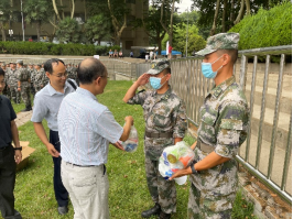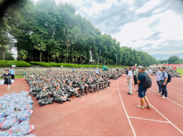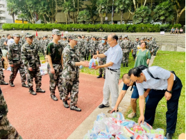 7月18日上午,9001cc金沙在东操场慰问托管在本院的2021级军训学生。分党委书记张早校、副书记陶磊、副院长伊春海带领四位新生班主任老师及院办同志一同向133位2021级学生及教官致以诚挚的问候并送上慰问品。
