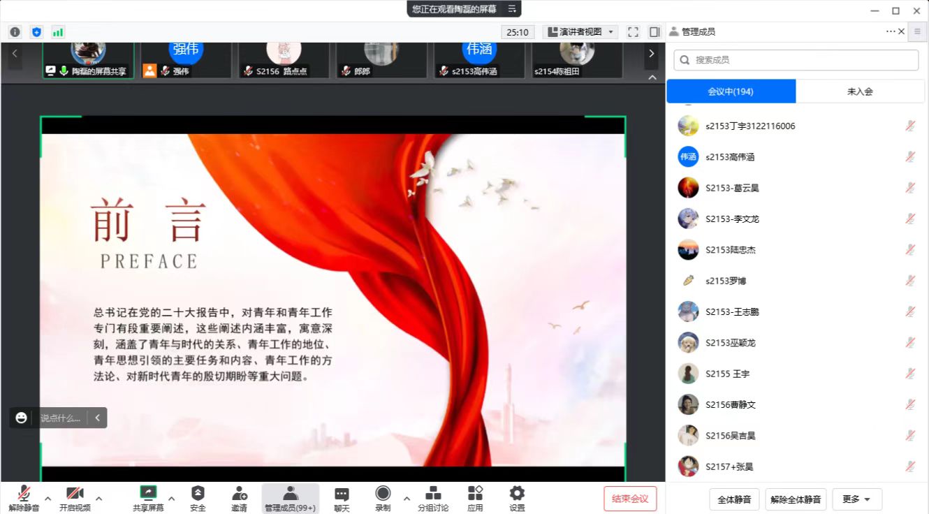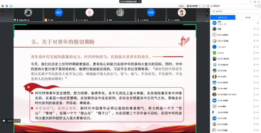党的二十大报告对广大青年提出了“立志做有理想、敢担当、能吃苦、肯奋斗的新时代好青年”的重要要求,为青年一代健康成长指明了努力方向。为深入贯彻党的二十大精神,引导广大青年牢记习近平总书记的殷切嘱托,让青春在全面建设社会主义现代化国家的火热实践中绽放绚丽之花。近期,9001cc金沙党委副书记陶磊为22级、20级全体研究生围绕“国家的希望在青年,民族的未来在青年”主题开展党的二十大精神宣讲,研究生辅导员强伟参加。