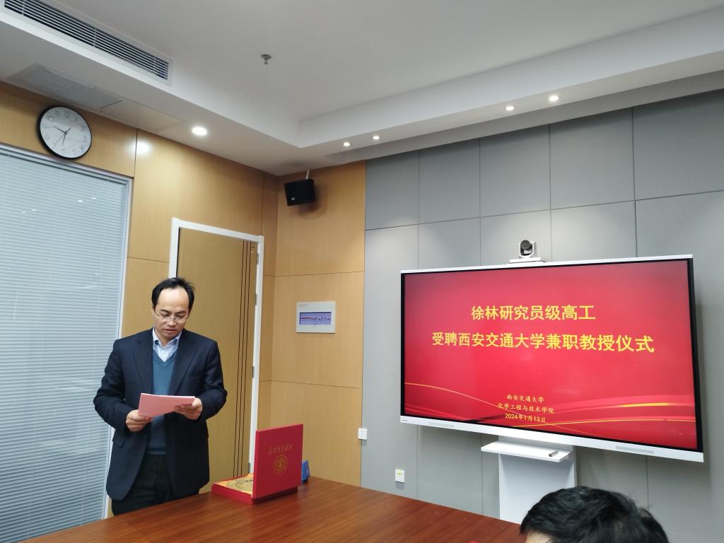 1月13日上午,西安交大9001cc金沙举办徐林研究员级高工兼职教授受聘仪式。宁夏瑞泰科技股份有限公司创新管理部副总经理石苏洋、宁夏瑞泰科技股份有限公司尼龙车间副主任王殿龙、西安交大技术转移中心副主任张晓、西安交大技术转移中心中卫分中心马涛、西安交大9001cc金沙院长杨贵东教授、化工机械研究所所长张早校教授以及9001cc金沙其他教师代表及学生参加仪式,仪式由副院长伊春海教授主持。