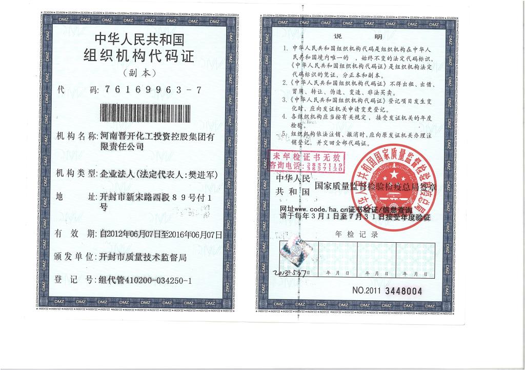 河南晋开集团组织机构代码证