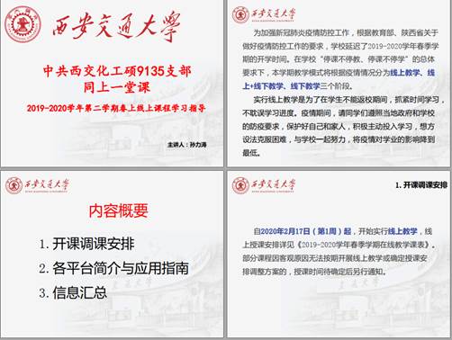 孙力涛同志给大家在线展示了如何使用“思源空间”、“雨课堂”等平台,闫浩祺同志指导使用校园VPN,并组织观看《如何提高自学能力》、《如何开展科研工作》等教学视频。希望大家能积极响应“停课不停学、停课不停研”,提醒大家要在思想上适应线上听课的方式,积极做好相关的准备工作。