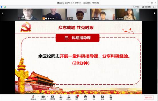 随后,余云松同志结合省教育厅的开学通知,提醒大家胸怀大局,服从学校安排,做好开学的规划。然后他带领大家学习了《关于规范高等学校SCI论文相关指标使用 树立正确评价导向的若干意见》的文件,他从“三个面向”的发展定位切入,希望大家要保持良好的精神面貌、把握正确的科研方向、做足科研准备、练习基本功、发掘学术价值,做出有利于社会进步的科研成果。