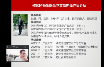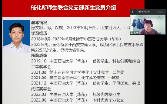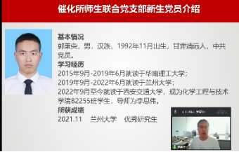 2022年9月28日,工业催化所师生联合党支部开展了“严守纪律规矩、加强作风建设”专题组织生活会暨9月党日活动。本次会议由支部书记吴志强同志主持,学院党委委员、副院长陈飞参会指导。因疫情影响,经请示上级组织,此次活动以线上方式进行。工业催化所师生联合党支部全体党员、入党积极分子参加本次会议。