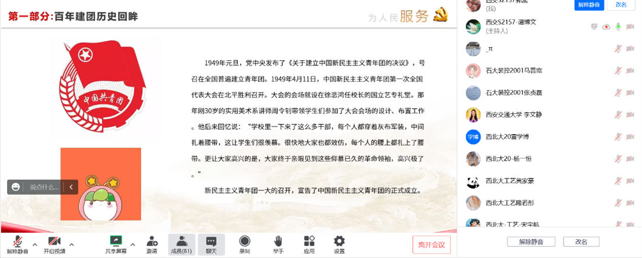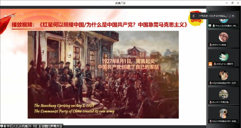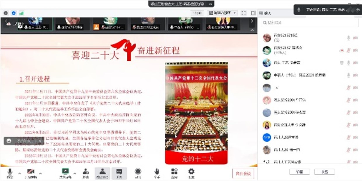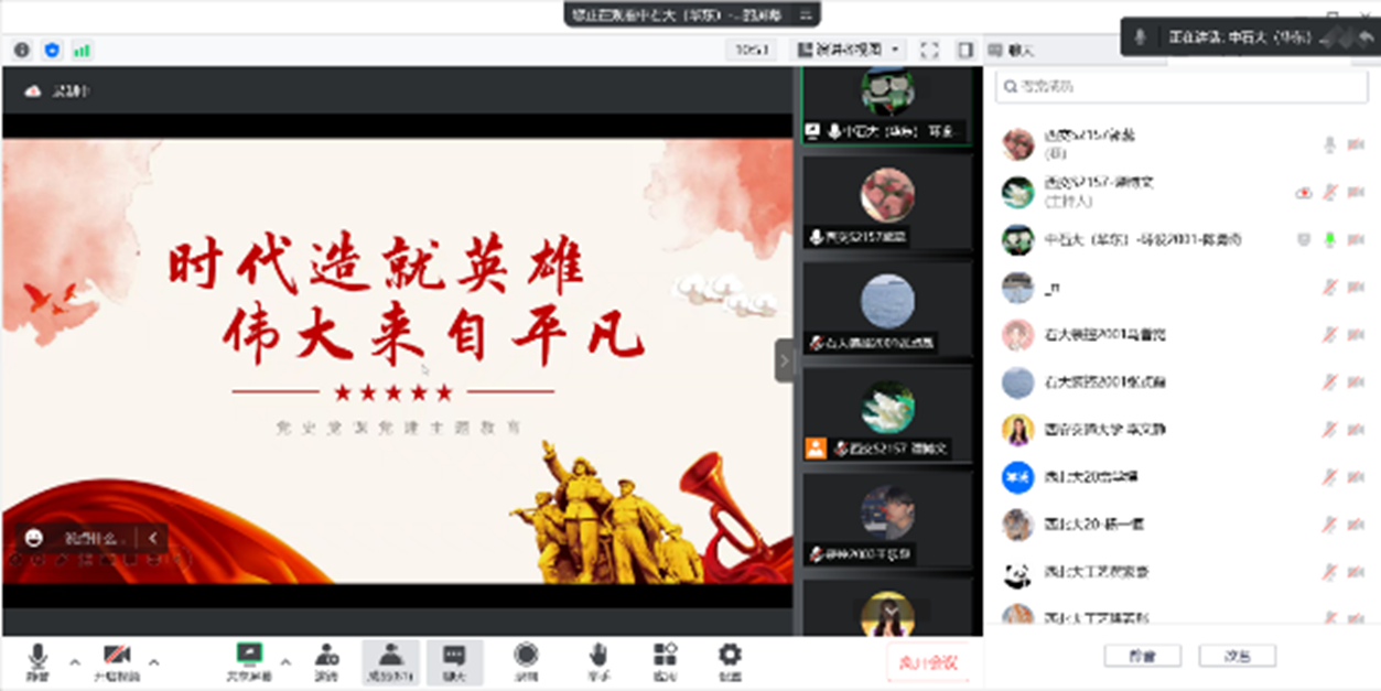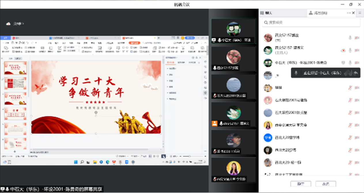 为增强硕2157党团班整体凝聚力,增进支部政治素养,提升支部政治风貌,2022年10月14日,在党支部支委谭博文主持下,9001cc金沙硕2157团支部与西北大学9001cc金沙化学工程与工艺团委2020级1班团支部、中国石油大学(北京)机械20-3团支部、中国石油大学(华东)装控2001团支部、装控2003团支部、环设2001团支部联合开展了“喜庆二十大,一起学历史”主题理论学习与交流活动。