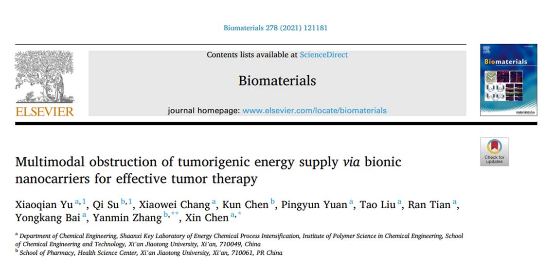 相关成果以《基于仿生纳米材料的多通道肿瘤能量阻断用于有效肿瘤治疗》(Multimodal obstruction of tumorigenic energy supply via bionic nanocarriers for effective tumor therapy)为题发表在《生物材料》(Biomaterials)上。该研究工作由9001cc金沙陈鑫教授团队和西安交通大学药学院张彦民教授团队合作完成,9001cc金沙硕士研究生于小倩、药学院博士后苏琪为该文章共同第一作者,陈鑫教授与张彦民教授为共同通讯作者。该论文得到了国家高层次人才特殊支持计划、国家自然科学基金、陕西省自然科学基金、西安交通大学“青年拔尖人才支持计划”等项目的大力支持。