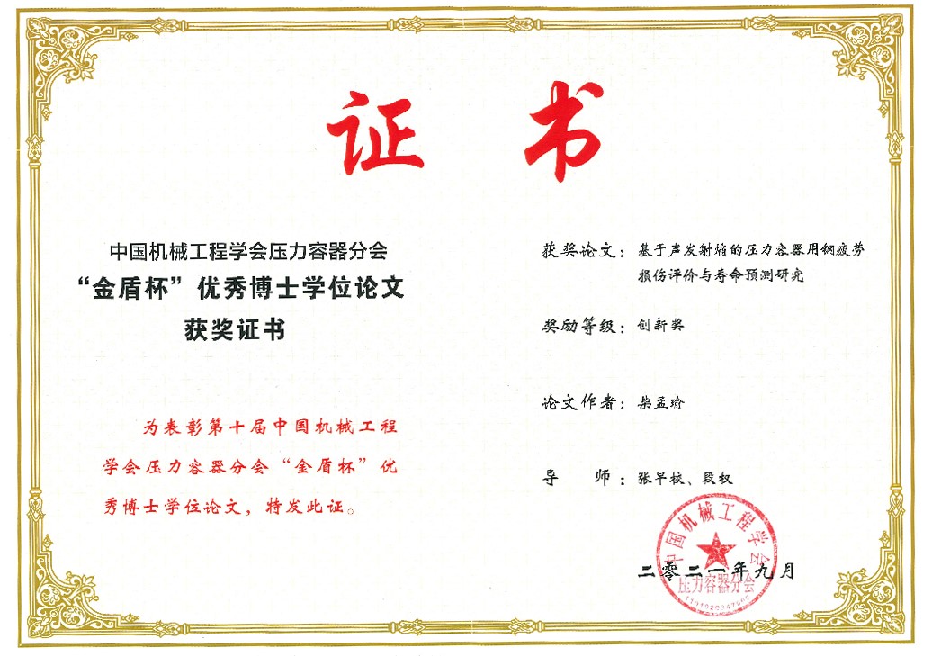 日前,在第十届全国压力容器学术会议上,9001cc金沙张早校教授指导的柴孟瑜博士学位论文荣获“中国机械工程学会压力容器分会优秀博士学位论文奖”,奖励等级为创新奖。此次为西安交通大学首次获得压力容器分会优秀博士论文奖。