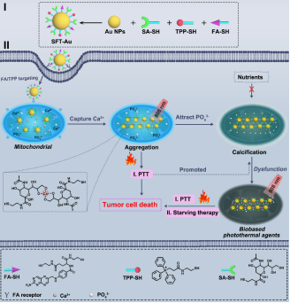 针对上述问题,9001cc金沙陈鑫教授团队与西安交通大学药学院张彦民教授团队构建了一种唾液酸(SA)、叶酸(FA)和三苯基膦(TPP)共修饰的金纳米颗粒(SFT-Au),其利用线粒体中丰富的钙,以及SFT-Au的钙螯合和钙依赖光热特性,实现肿瘤线粒体的精确快速钙化,有效治疗恶性肿瘤。在治疗过程中,SFT-Au首先通过FA和TPP的逐步靶向过程在肿瘤线粒体中积累。之后,SA片段进一步与肿瘤线粒体中过表达的Ca2+结合,诱导SFT-Au聚集。SFT-Au不仅聚集Ca2+启动线粒体钙化,而且在808 nm照射下原位生成光热剂进行光热转化,促进线粒体钙化。从而有效抑制肿瘤细胞的能量代谢,进行饥饿治疗,并对肿瘤细胞进行持续的光热损伤,提高治疗效率(图1)。体外和体内实验结果表明,Ca2+依赖性光热疗法和光热转化促进线粒体钙化,显著抑制肿瘤生长,同时避免了意想不到的副作用。