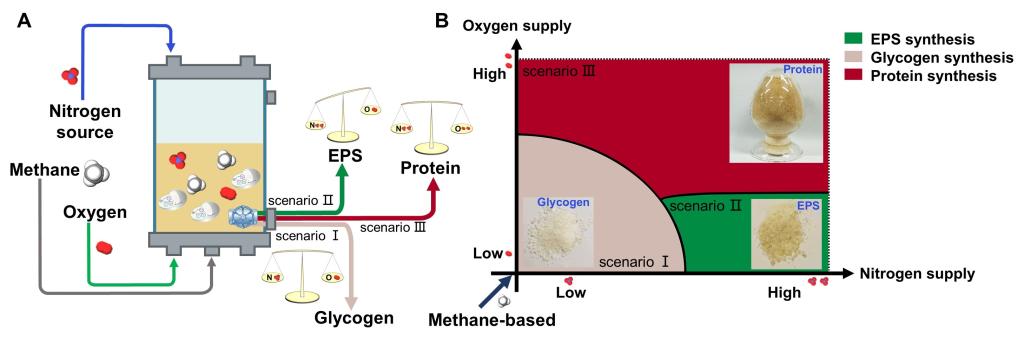 近年来,我国高度重视甲烷气体的减排与高效利用。针对当前存在的问题,西安交通大学费强教授团队创新性地提出了利用微生物转化甲烷气体合成高价值大分子产品的新策略。他们成功开发了针对嗜甲烷菌细胞工厂高效合成细胞蛋白和多糖聚合物的高密度发酵技术,并深入解析了细胞工厂中碳氮代谢流的协同适配机制。该研究首次引入基于氮氧营养的可控性诱导策略,通过人工定向强化,显著提升了特定产物的生产效率。这一策略实现了甲烷到大分子产品的高效一步转化,为甲烷的高价值利用和新质生产力的发展开辟了全新的道路。